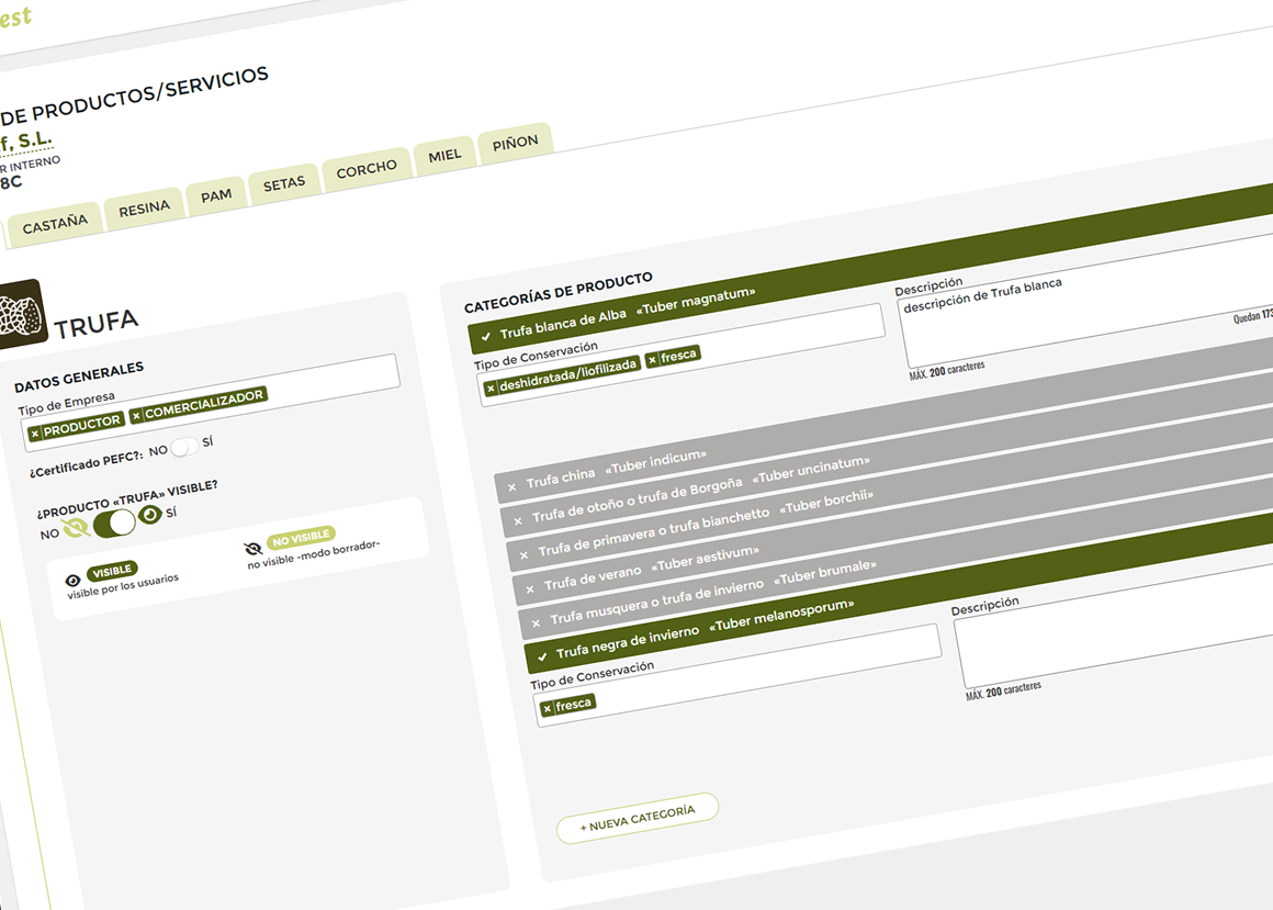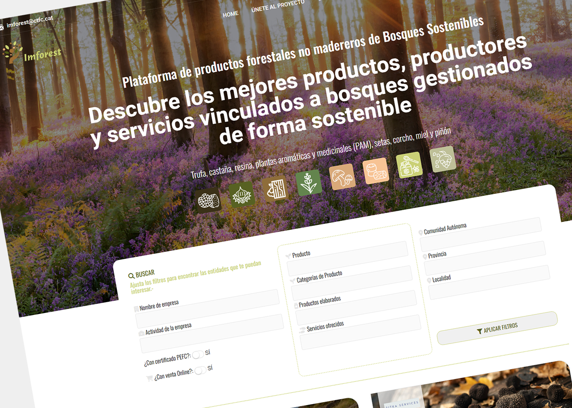 La Plataforma de productos forestales no madereros de Bosques Sostenibles, en una solución digital orientada a la puesta en valor de recursos forestales sostenibles (trufa, castaña, resina, plantas aromáticas y medicinales -PAM-, setas, corcho, miel y piñón), facilitando la visibilidad, gestión y comercialización de productos no madereros procedentes de entornos certificados y responsables. El proyecto tiene como objetivo conectar productores, gestores y usuarios finales mediante una plataforma accesible y estructurada.